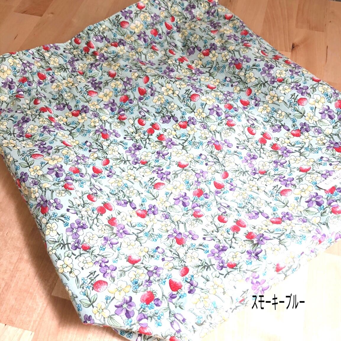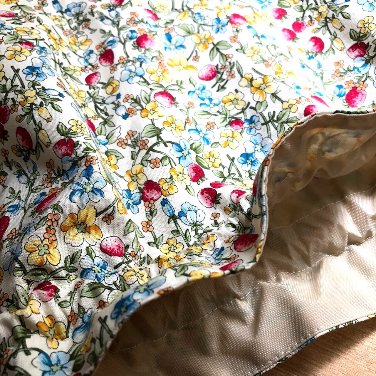表地は、薄手のシーチング生地使用で、シワの戻りが安易。こちらの柄はシワがついてもわかりにくい柄です!裏地付きでもごわつかずに使用感は優しいです!