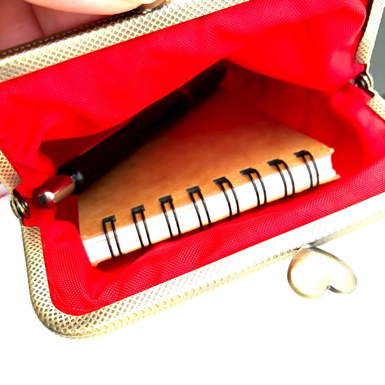 メモ帳とペンをいれて写真を撮ってみましたので、サイズ感の参考にしてください!