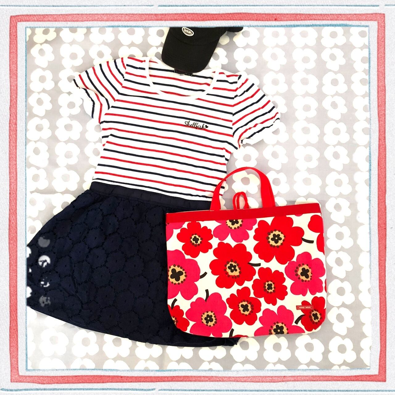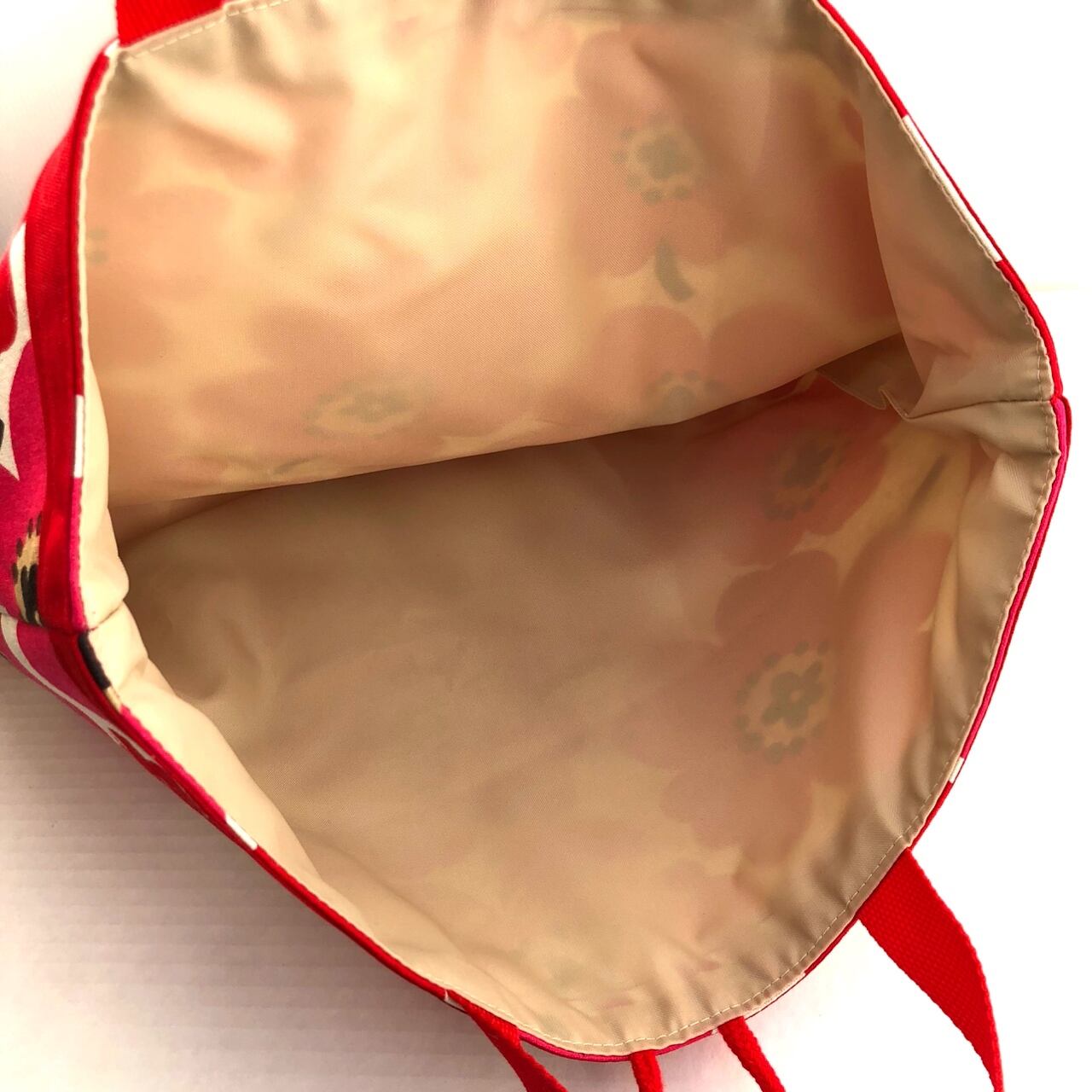 北欧風の赤い花柄で綿麻生地口側に赤のバイアステープを重ねています☆