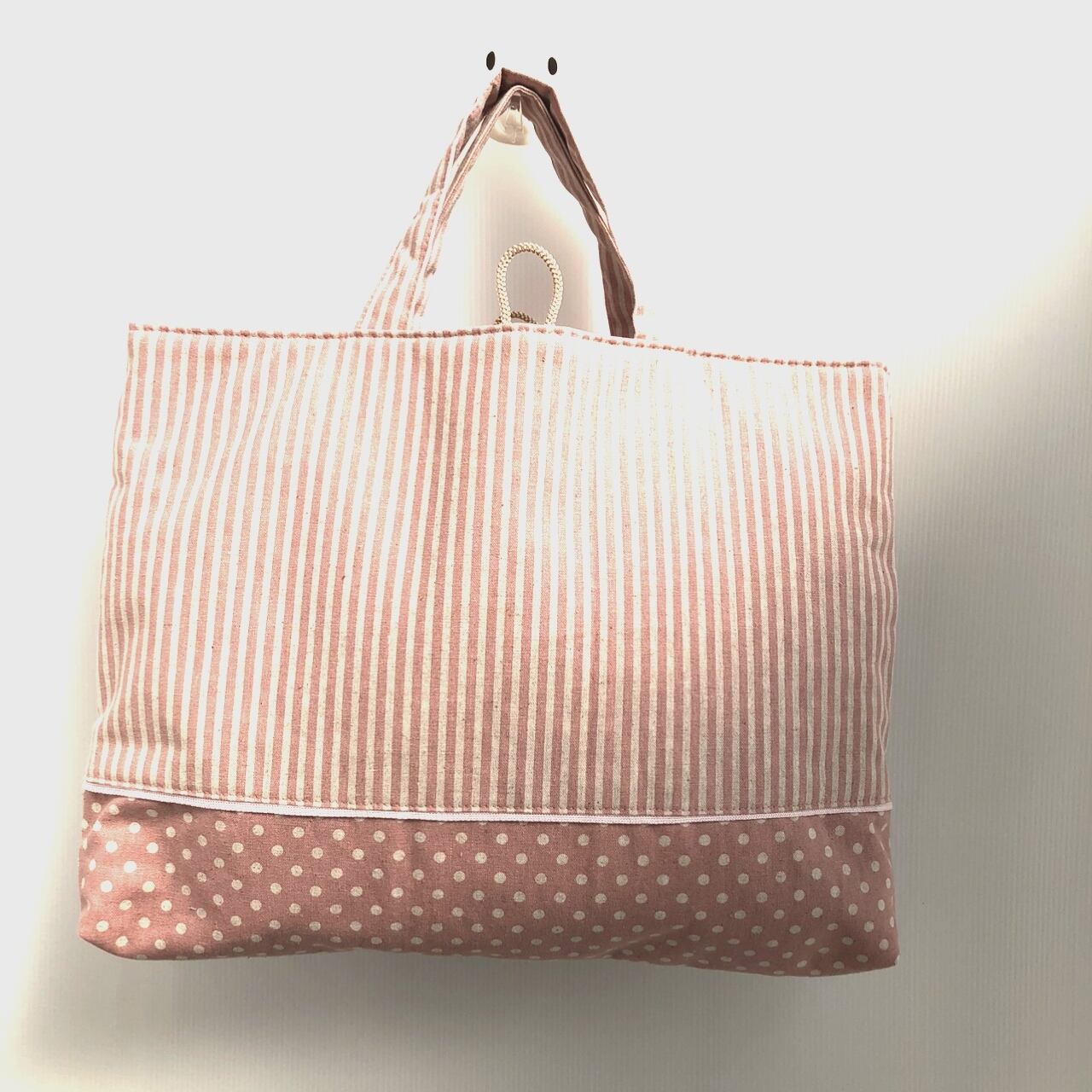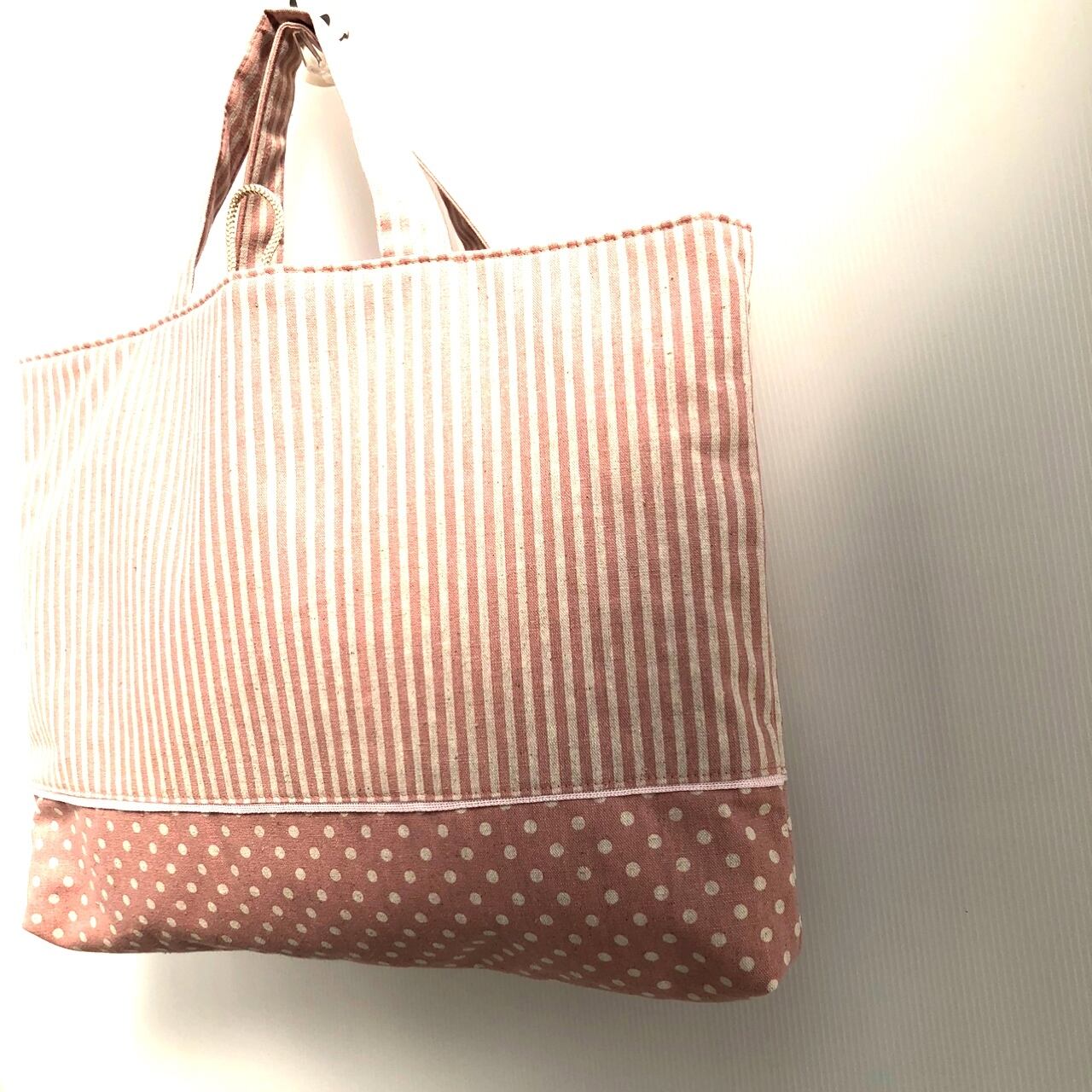綿麻生地のストライプとドット柄を合わせ、あいだにパイピングテープをはさんでいます。