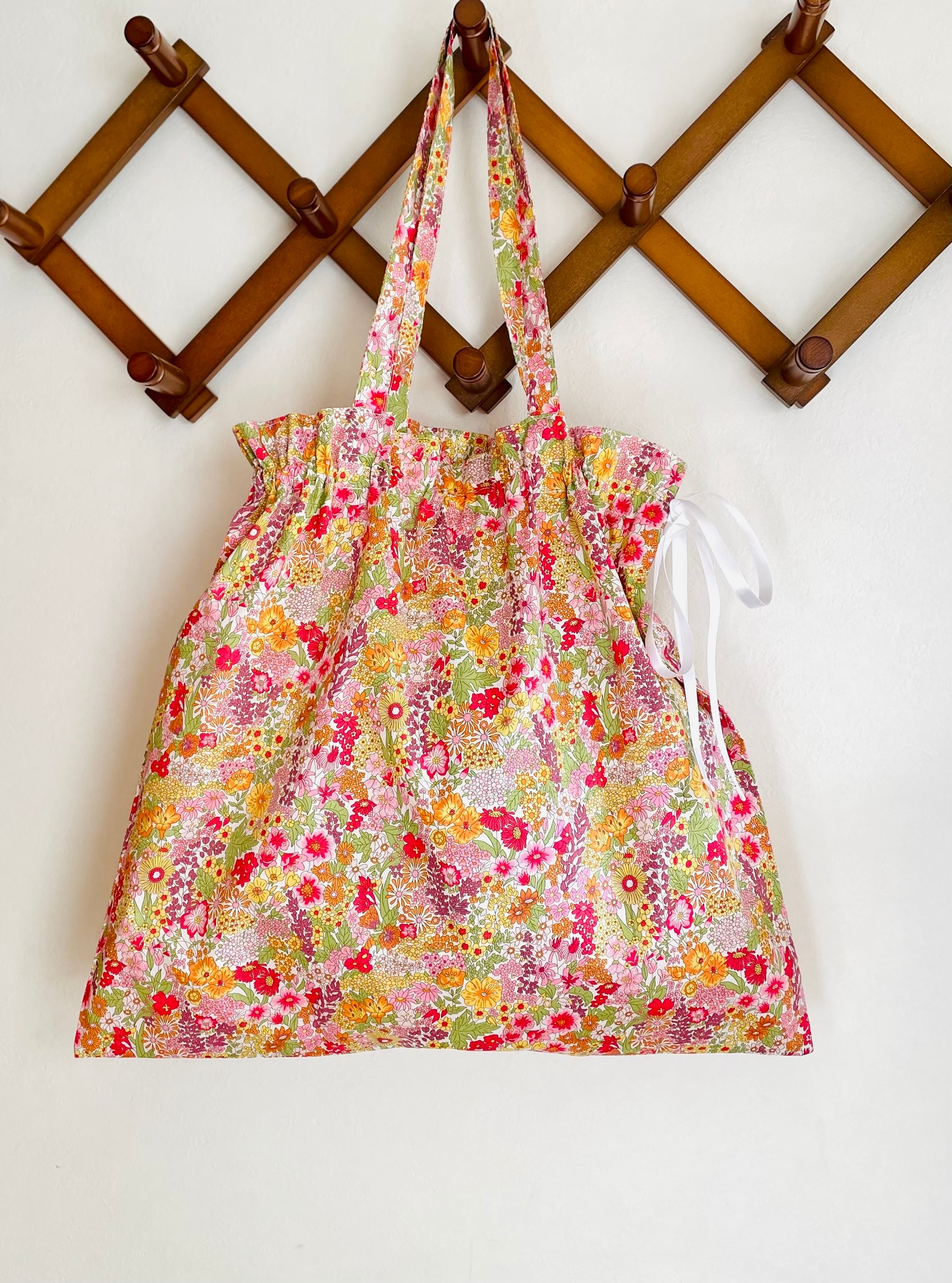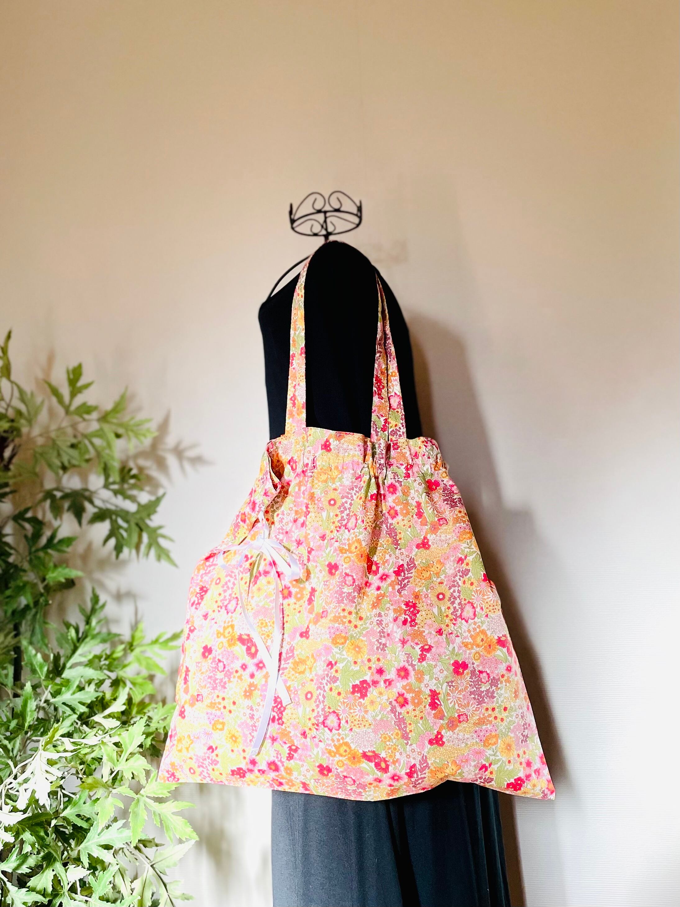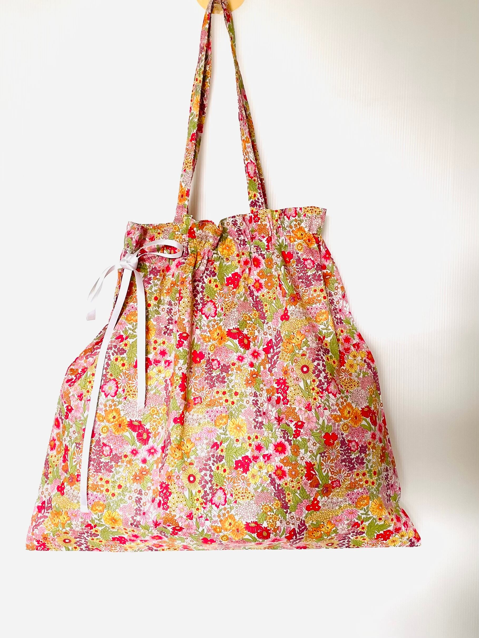 リバティプリントのリボン巾着バッグマーガレットアニー